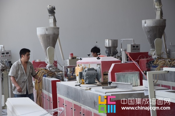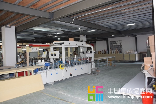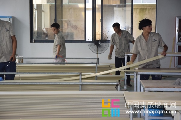 在三一阳光营销总监苌总的陪同下,我们首先来到了生产车间,映入眼帘的是车间整齐划一层层堆叠的板材与竹木纤维集成墙面的原材料。在苌总的引导下,我们看到车间多条正在生产的大规模挤出线,操作工人们正在不停忙碌奔波。