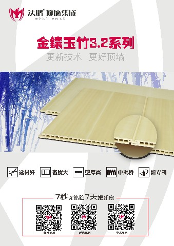 一、选材好 本品选用出产于江浙一带的名贵竹品——金镶玉竹纤维。金镶玉竹为竹中珍品,其珍奇处在那嫩黄色的竹竿上,于每节生枝叶处都天生成一道碧绿色的浅沟,位置节节交错。一眼望去,如根根金条上镶嵌着块块碧玉,清雅可爱,故古海州志中称其为"金镶碧嵌竹"。 “金镶玉竹3.2系列”集成墙面还加入上好香樟木纤维,能很好地防止蛀虫滋生,全新料,原生态,更加环保耐用;