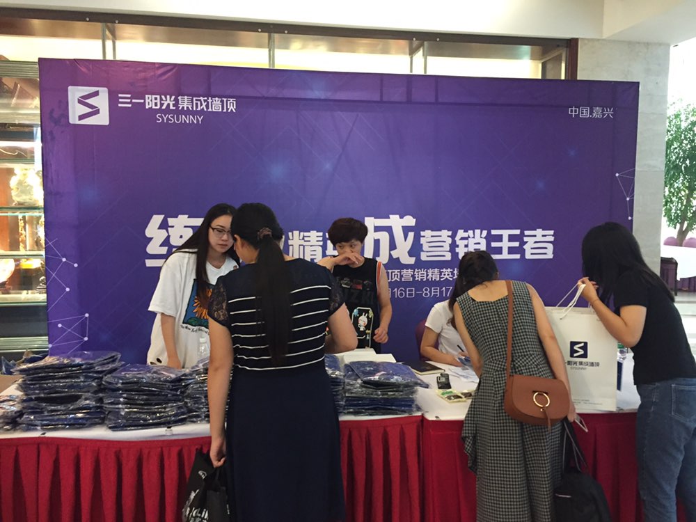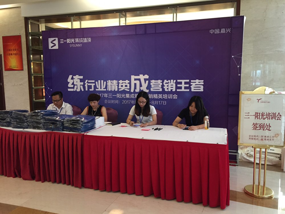 这个夏天,由三一阳光独家主办的《练行业精英 成营销王者——2017年三一阳光集成墙顶营销精英培训会》将于明后两天在嘉兴新洲国际大酒店隆重举行。这两天,三一阳光的家人们纷纷回嘉签到。三一阳光的工作人员也在会场处欢迎他们回嘉。