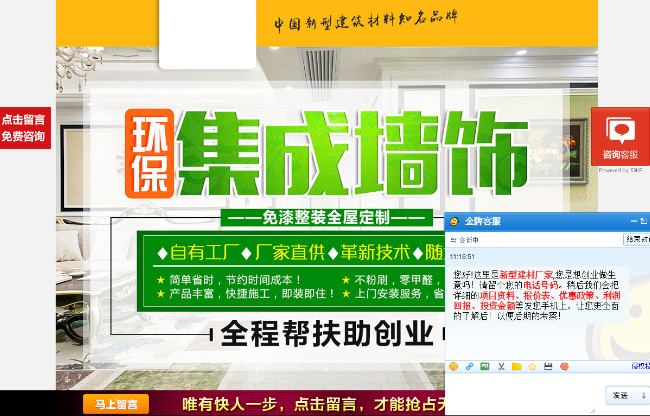 打开这几个网址进入后,就会发现,这些网页展示的全是环保集成墙面加盟信息,五颜六色的网页传达着诱人的项目和加盟政策,并且网页立即会跳出弹框,联系你并索要电话号码,且在尾端会让您留言让您填写加盟信息。