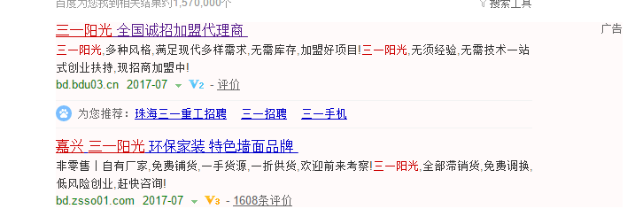 根据举报人提供的搜索引擎,我司工作人员经过搜索引擎框内搜索“三一阳光”发现,跳出来的米兰MiLan(中国)前两个链接都显示了“三一阳光”,而且这些都标注了广告。